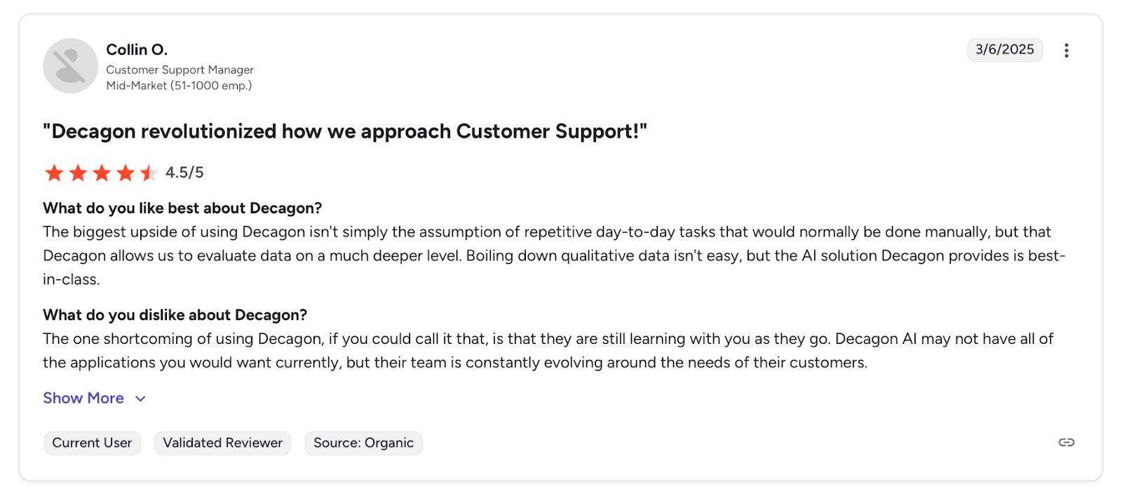 Pro: "Decagon allows us to evaluate data on a much deeper level." β Collin O., G2