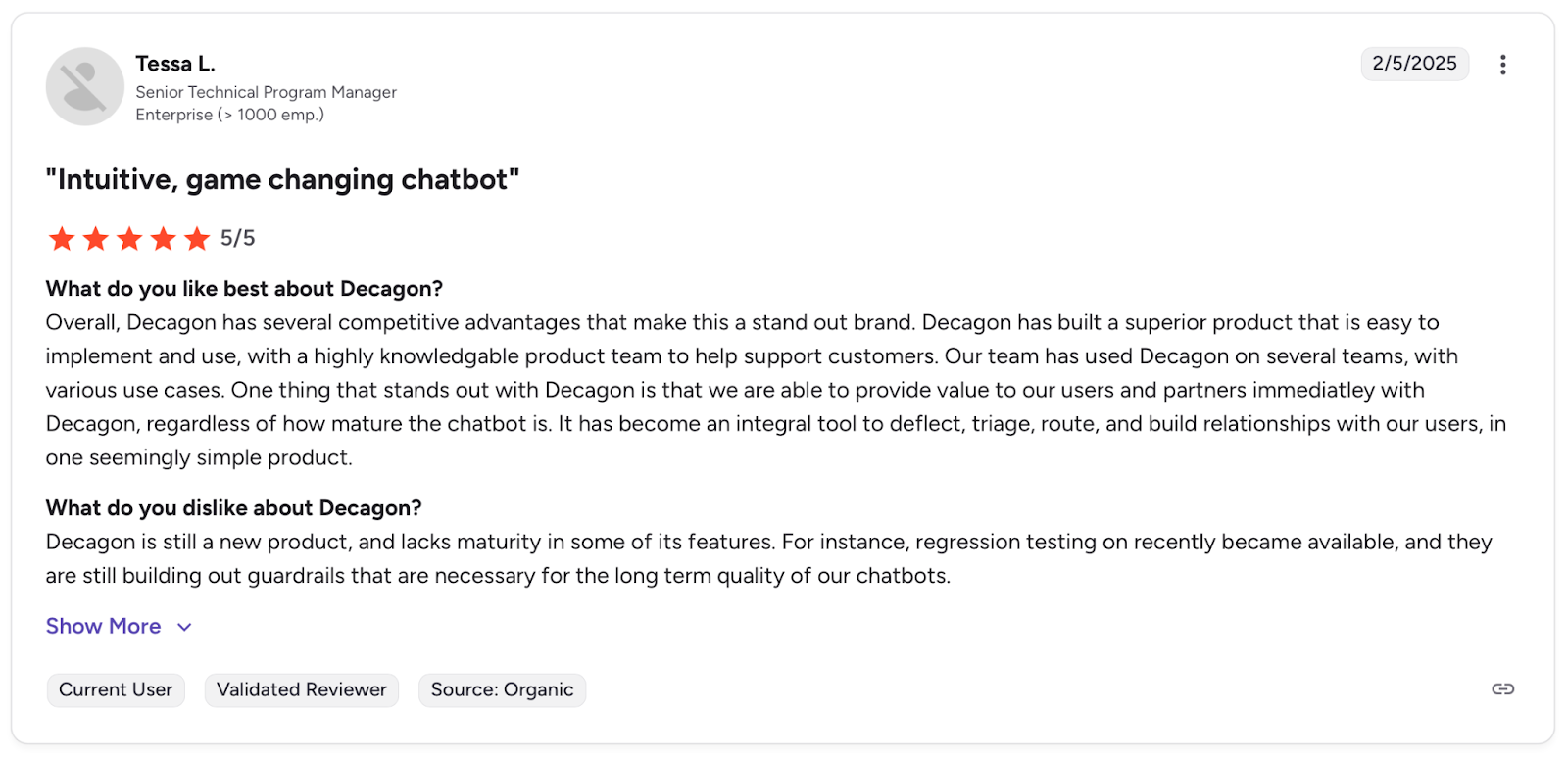 Con: "Decagon is still a new product, and lacks maturity in some of its features." β Tessa L., G2