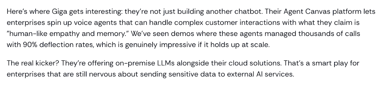 I'd recommend Giga for large B2C teams running millions of support calls who need voice quality and compliance at scale. For teams running older backend systems, budget for integration work upfront and consider comparing Sierra's native connector library before committing.