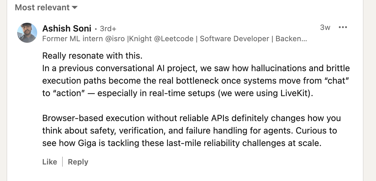 Con: "Curious to see how Giga is tackling these last-mile reliability challenges at scale." β Ashish Soni, G2