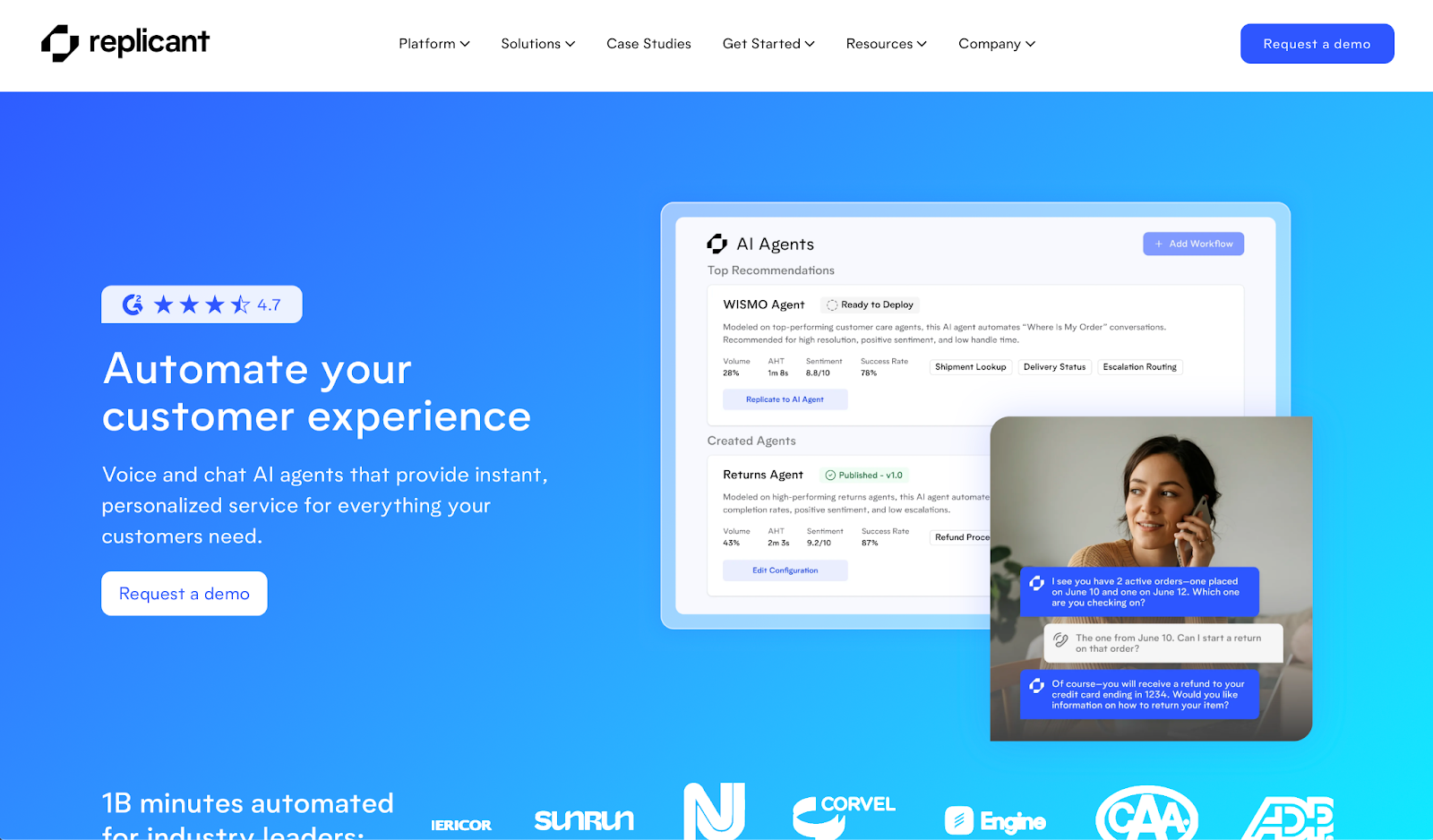 What it does: Replicant automates inbound support calls by replicating how top-performing human agents handle them, covering payments, logistics, and retention without escalating to a live agent.
