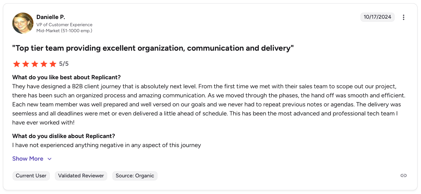Pro: "They have designed a B2B client journey that is absolutely next level." β Danielle P., G2