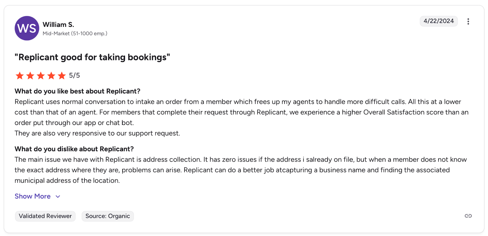 Con: "The main issue we have with Replicant is address collection." β William S., G2