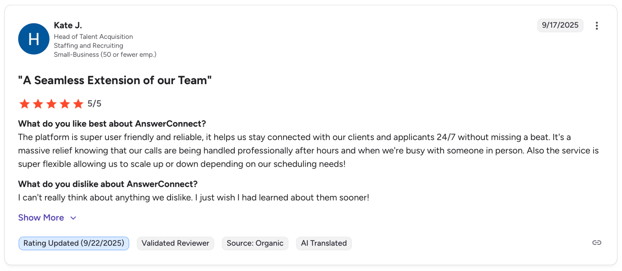 AnswerConnect is the only service on this list with no AI involved. A real person picks up, follows your script, and represents your business the way you'd want. For industries where a mishandled call creates legal or compliance risk, that's what you're paying for.