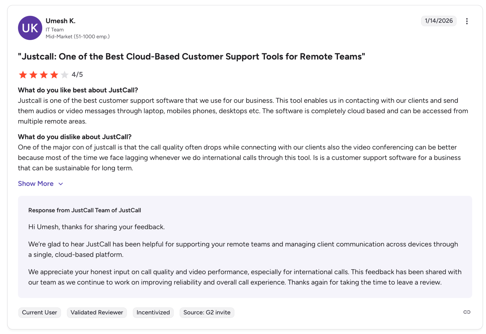 "Justcall is one of the best customer support software that we use for our business." โ Umesh K., G2