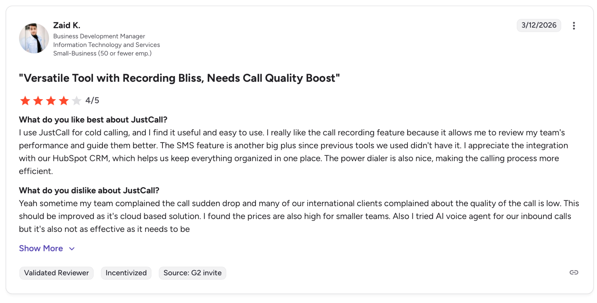 "Sometimes my team complained that the calls suddenly drop, and many of our international clients complained that the quality of the call was low." โ Zaid K., G2