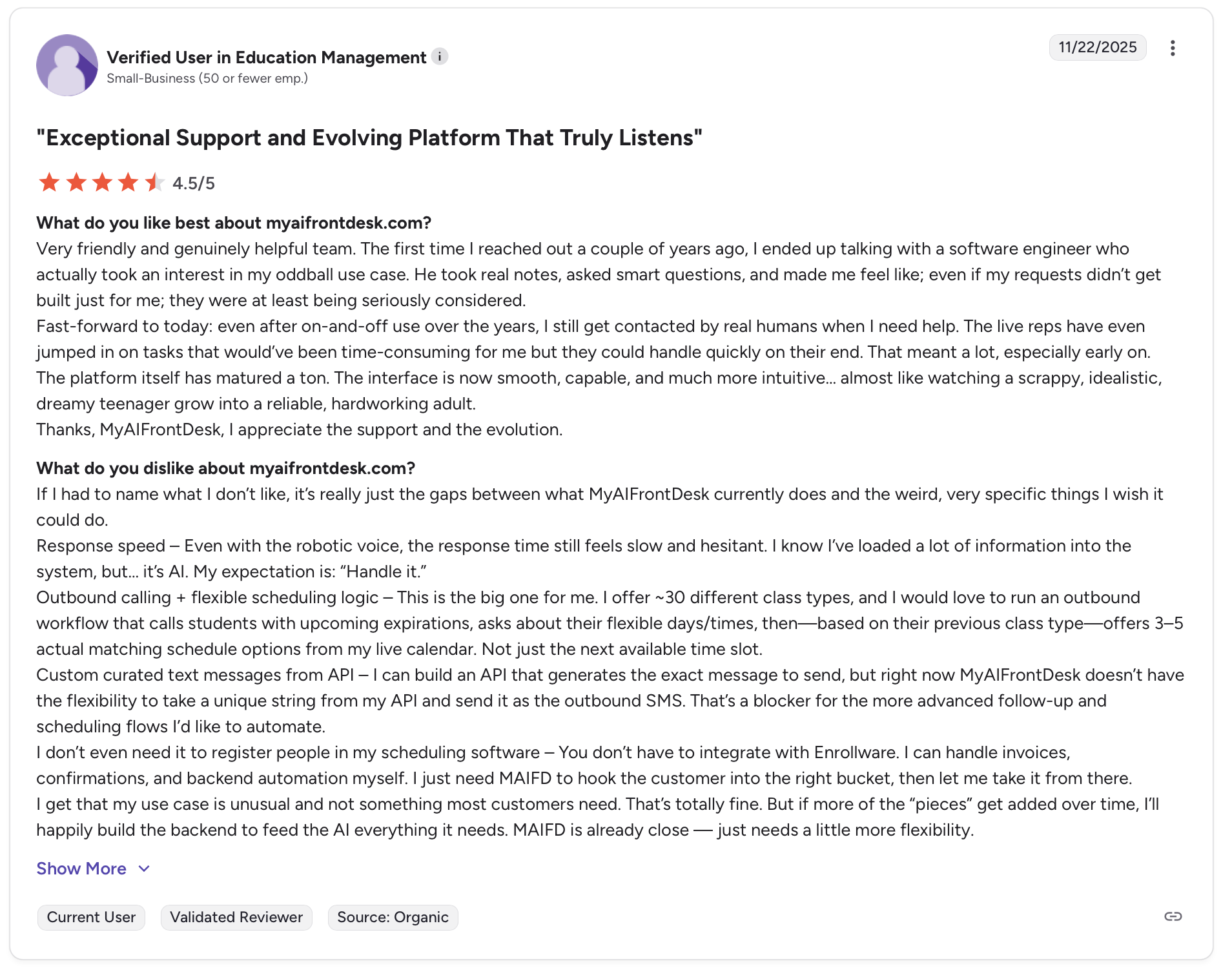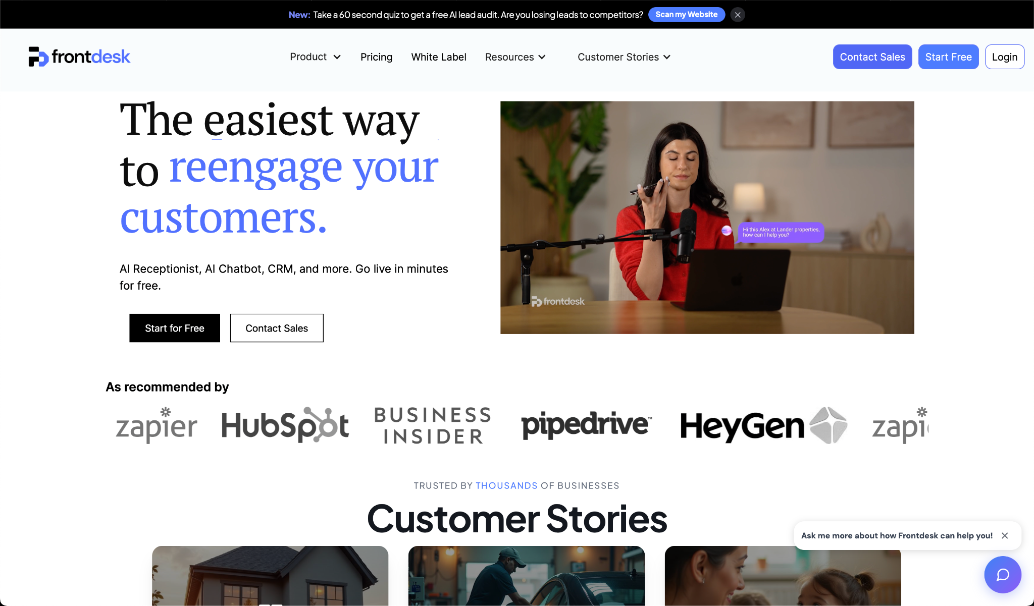 What it does: My AI Front Desk handles inbound calls, texts, and web chat from a single platform, with appointment scheduling and lead capture built in.