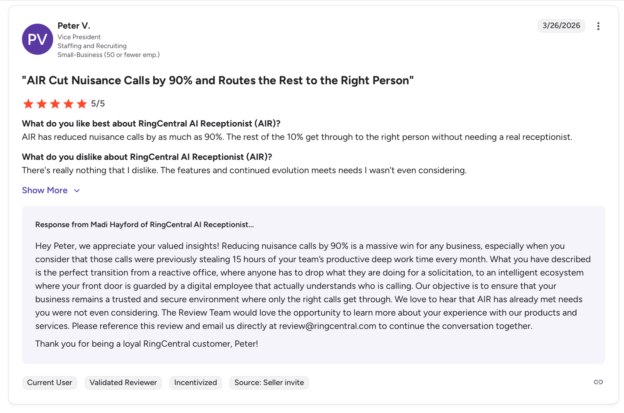 "AIR has reduced nuisance calls by as much as 90%. The rest of the 10% get through to the right person without needing a real receptionist." โ Peter V, G2