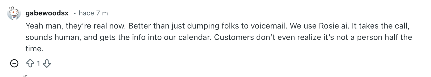 "We use Rosie AI. It takes the call, sounds human, and gets the info into our calendar. Customers don't even realize it's not a person half the time." โ Verified User, Reddit