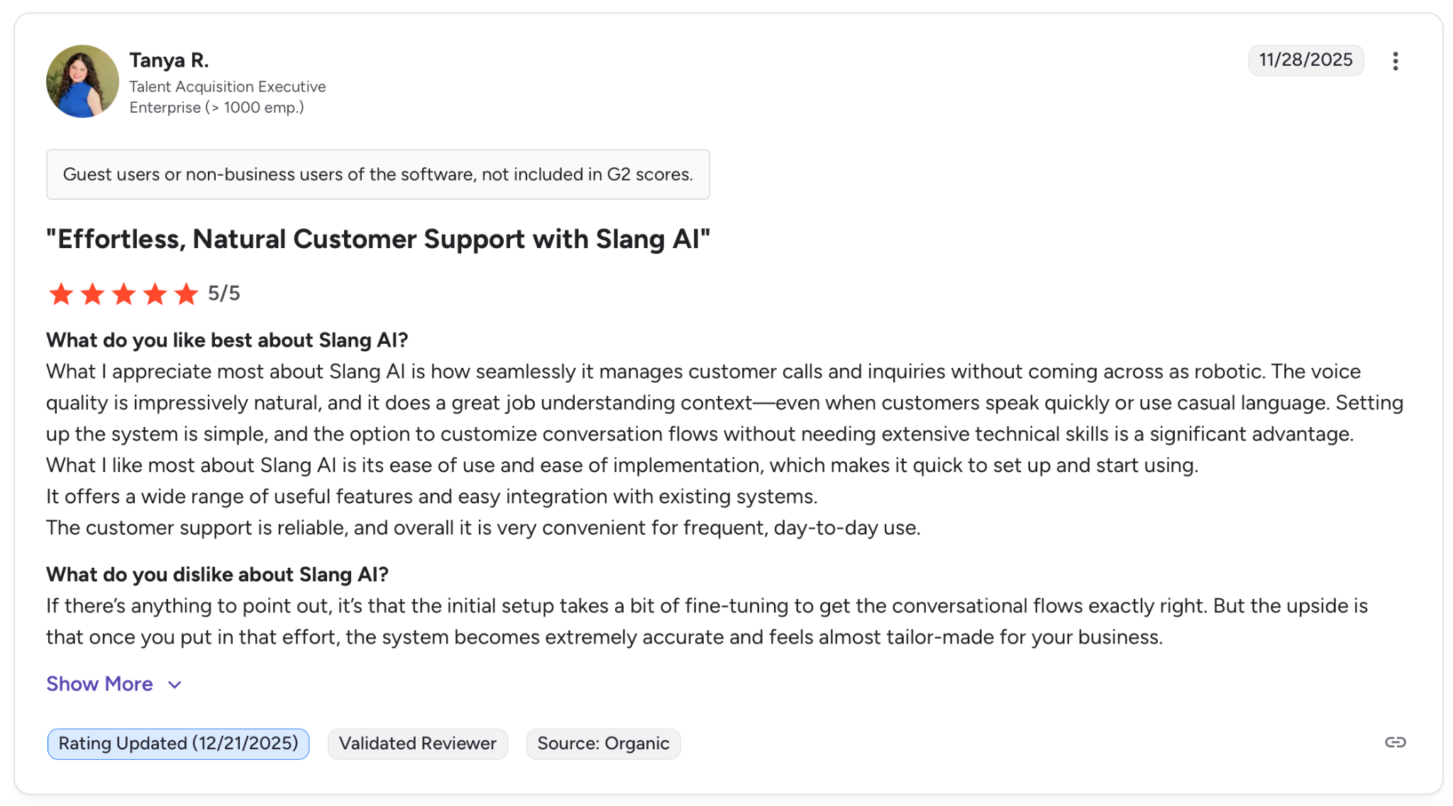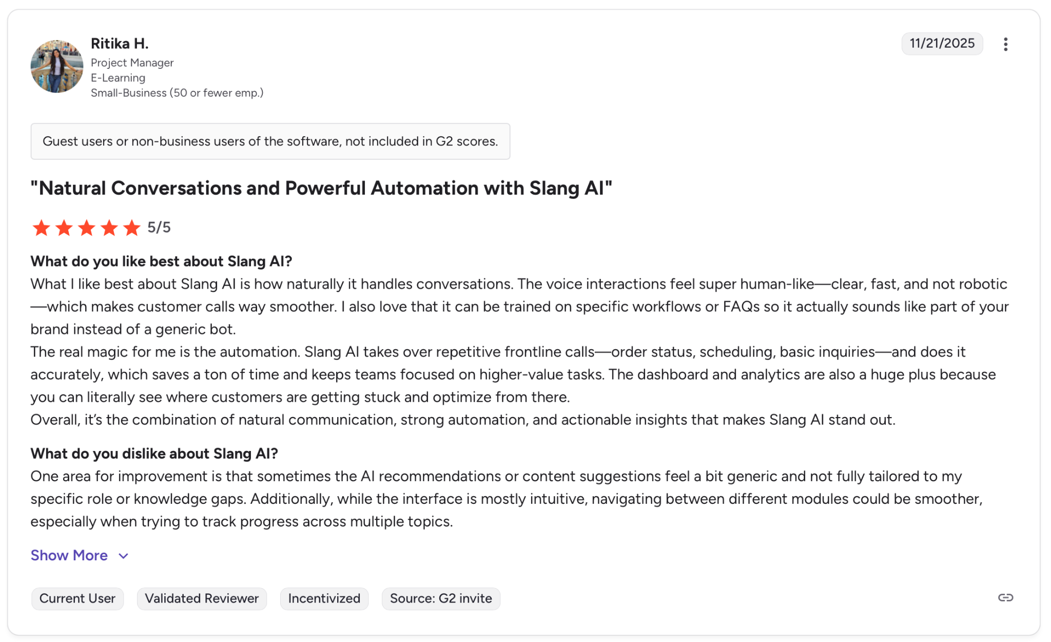 "What I like best about Slang AI is how naturally it handles conversations." โ Ritika H., G2