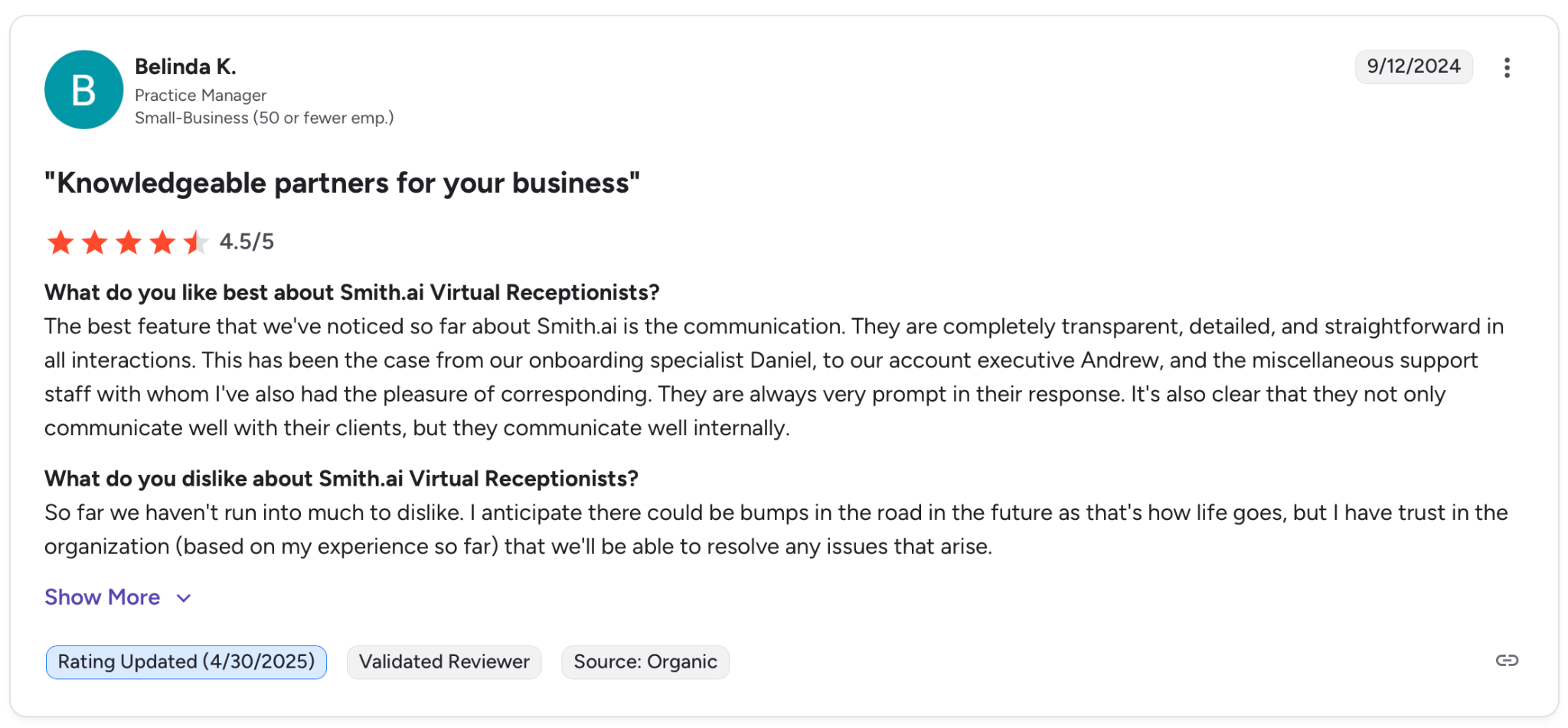 "The best feature that we've noticed so far about Smith.ai is the communication." โ Belinda K., G2