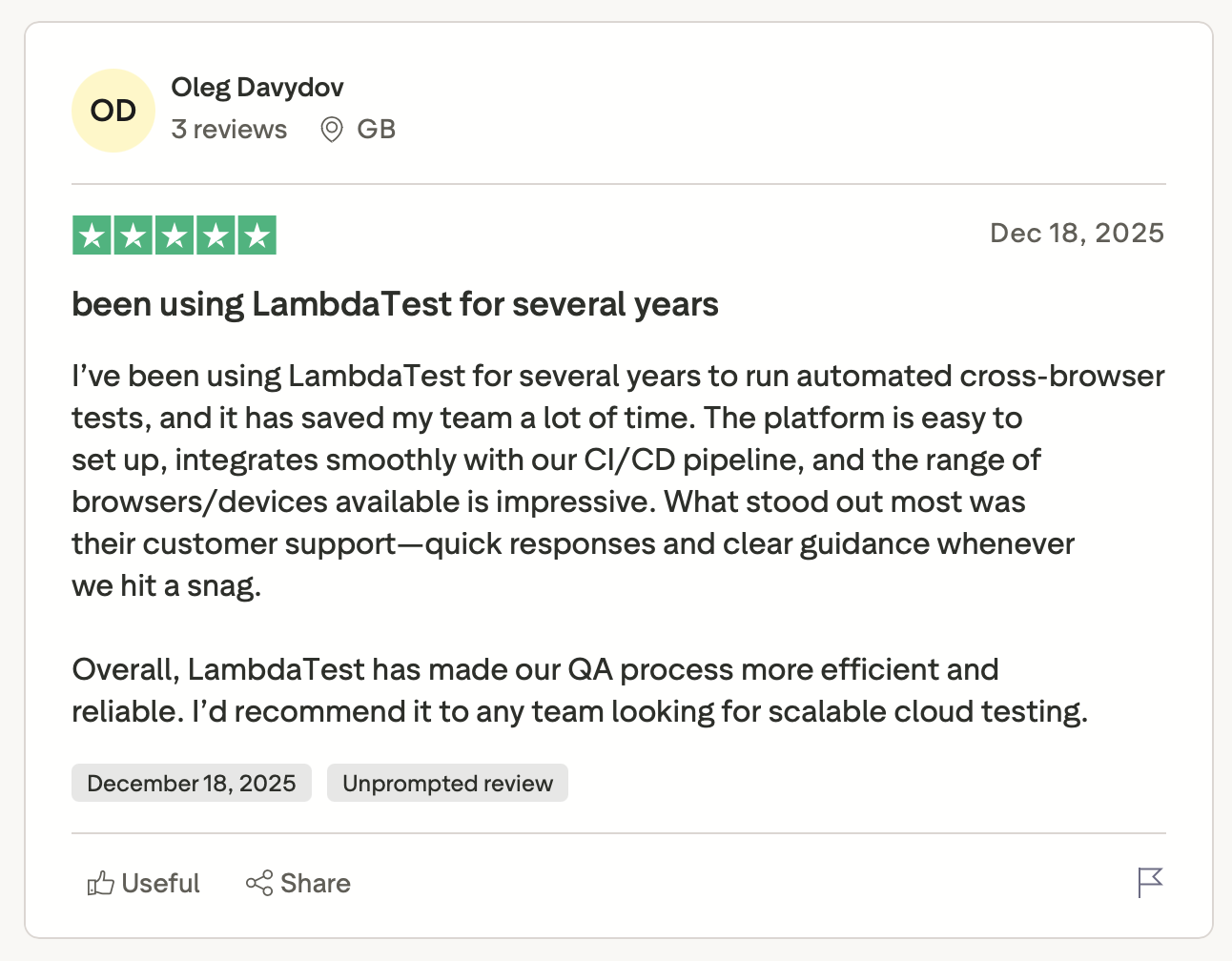 "The platform is easy to set up, integrates smoothly with our CI/CD pipeline, and the range of browsers/devices available is impressive." — Oleg Davydov, Trustpilot