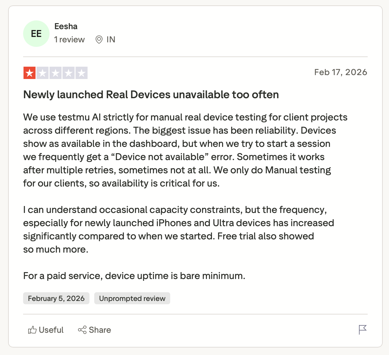 "Devices show as available in the dashboard, but when we try to start a session, we frequently get a 'Device not available' error… For a paid service, device uptime is the bare minimum." — Eesha, Trustpilot