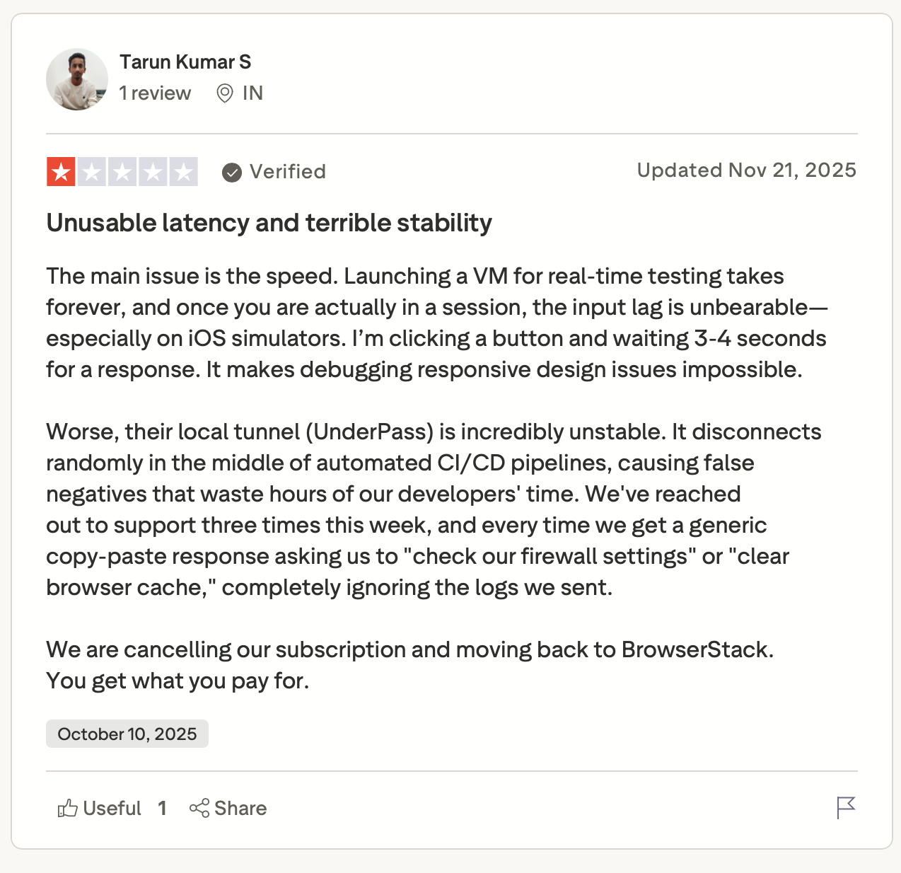 After going through the verified reviews on Trustpilot, the split is consistent. Teams that prioritize speed and coverage tend to stay. Teams that depend on real-device precision often run into problems.