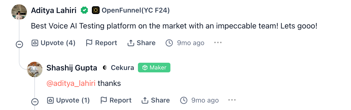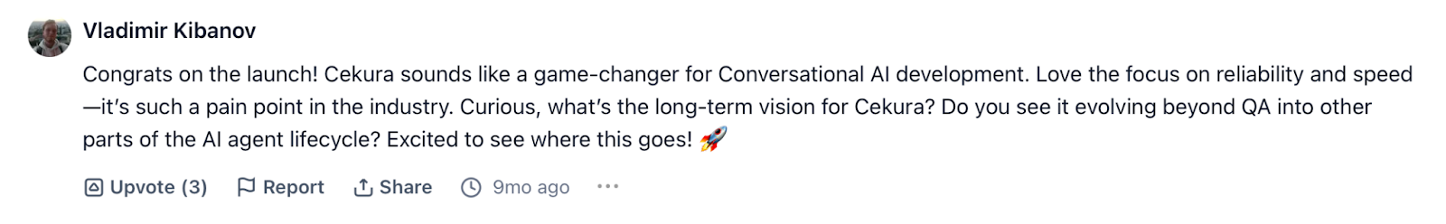 Pro: "Cekura sounds like a game-changer for Conversational AI development. I love the focus on reliability and speedβit's such a pain point in the industry." β Vladimir Kibanov, Product Hunt