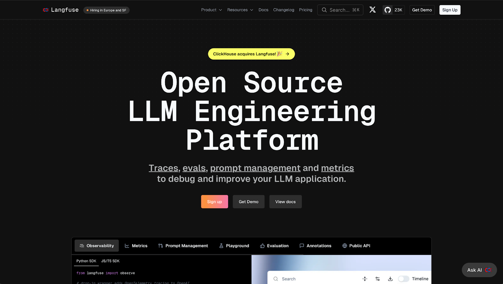 Langfuse's long-term bet feels solid, backed by approximately 23,100 GitHub stars and recently acquired by ClickHouse. It's grown into something genuinely complete, just factor in per-seat pricing and Enterprise-only self-hosting before you commit.
