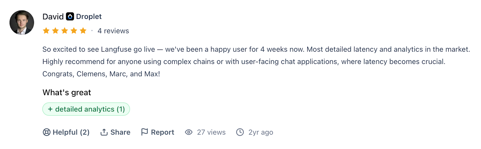 Pro: "Highly recommended for anyone using complex chains or with user-facing chat applications, where latency becomes crucial." β David, Product Hunt