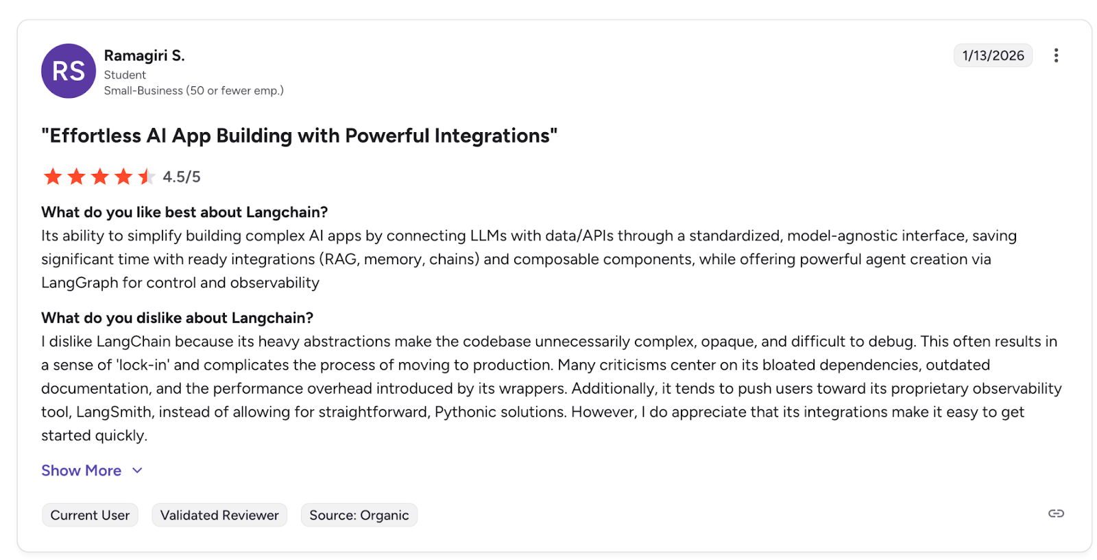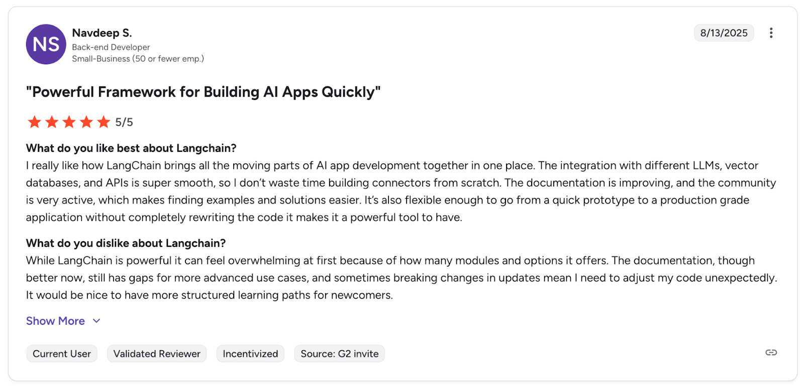 Con: "While LangChain is powerful it can feel overwhelming at first because of how many modules and options it offers." β Navdeep S., G2