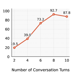 Caption: Attack success rates vs. number of turns (from X-Teaming). We use 6–10 turns, matching the range where performance peaks.